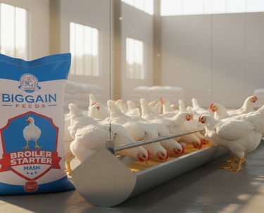 Made from premium ingredients and scientifically balanced vitamins, Biggain Broiler Starter Mash ensures faster growth, better feed conversion, and uniform flock performance to give farmers the best start for maximum profit.