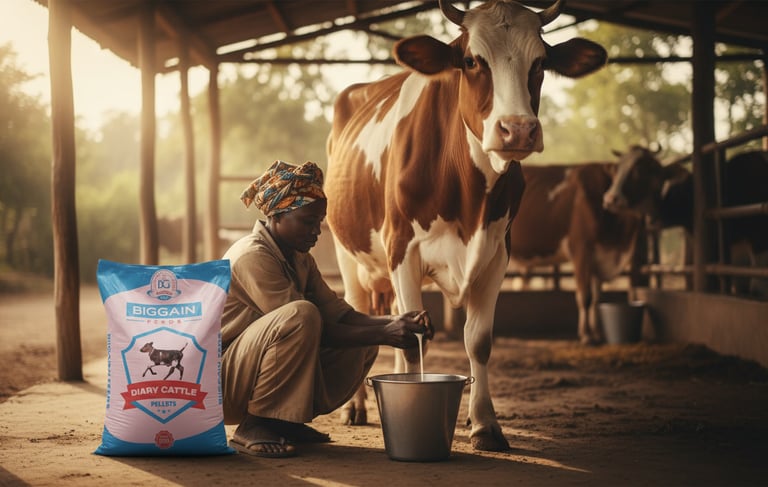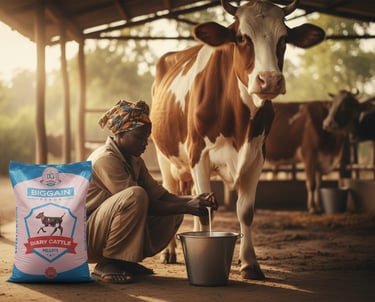 Biggain Dairy Cattle Pellets are scientifically formulated to boost milk yield, strengthen cow health, and support reproductive performance in Nigeria’s dairy farms. Each pellet is rich in energy, protein, vitamins, and essential minerals that help cows maintain body condition and produce clean, nutritious milk consistently.