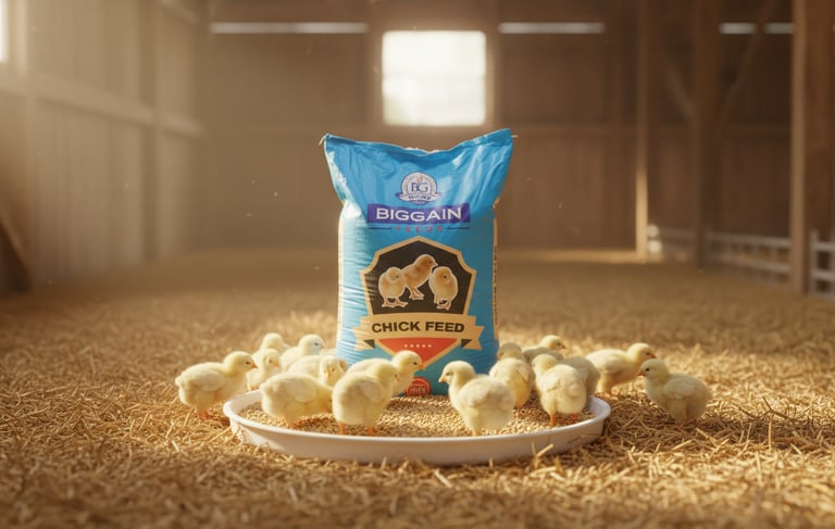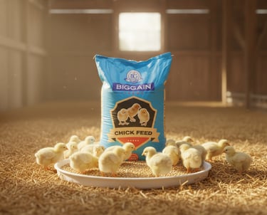 Biggain Chick feed is a specially formulated starter feed designed to give chicks the strongest possible beginning. Enriched with highly digestible proteins, essential amino acids, vitamins, and minerals, it helps chicks grow fast, stay healthy, and build strong immunity from day one.