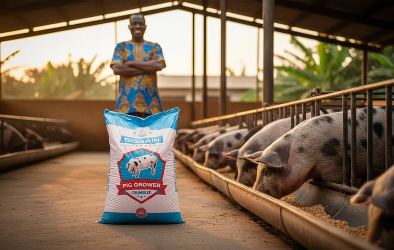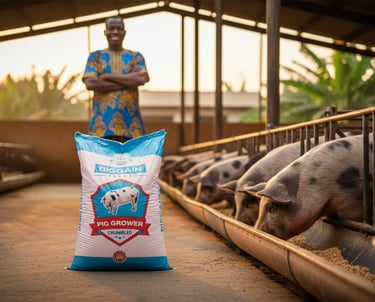 Developed under expert supervision, Biggain Pig Grower ensures consistent performance even under Nigeria’s tropical climate. It supports clean, odor-free pens, steady weight gain, and healthier pigs — making it the top choice for pig farmers who want real value for money and measurable results.