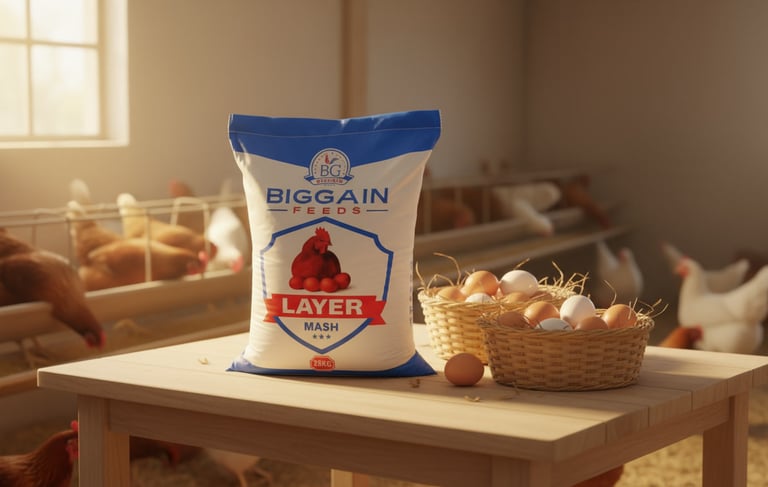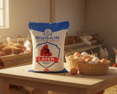 Biggain Layer Mash is a premium-quality feed specially formulated for laying hens in Nigeria’s tropical climate. It provides the perfect balance of energy, protein, vitamins, and minerals needed for steady egg production, strong shells, and healthy birds. Designed by expert nutritionists and tested on Nigerian farms, this mash ensures your hens deliver consistent performance and profitability every cycle.