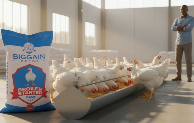 Biggain Broiler Starter Mash is a high-energy, protein-rich feed formulated to help young broiler chicks grow rapidly from day one. Designed for chicks between 0 to 4 weeks old, this feed provides all the nutrients required for muscle development, bone strength, and immunity support.